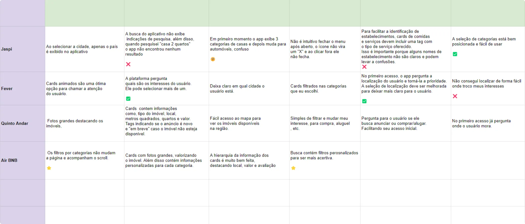 Devido ao prazo apertado para concluir o projeto, decidimos adotar um processo de pesquisa ágil e eficiente. Nesse sentido, optamos por utilizar o Benchmarking como nossa principal ferramenta de pesquisa. Pelo motivo da urgência expressa pelo cliente em atualizar a página inicial do aplicativo, tomei a decisão de realizar uma análise comparativa rápida das telas iniciais de aplicativos conhecidos, incluindo Fever, Quinto Andar e Airbnb.