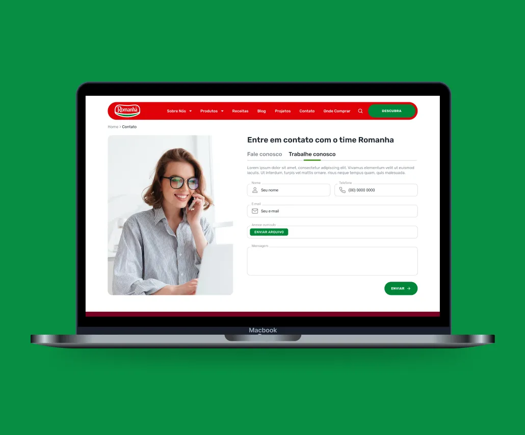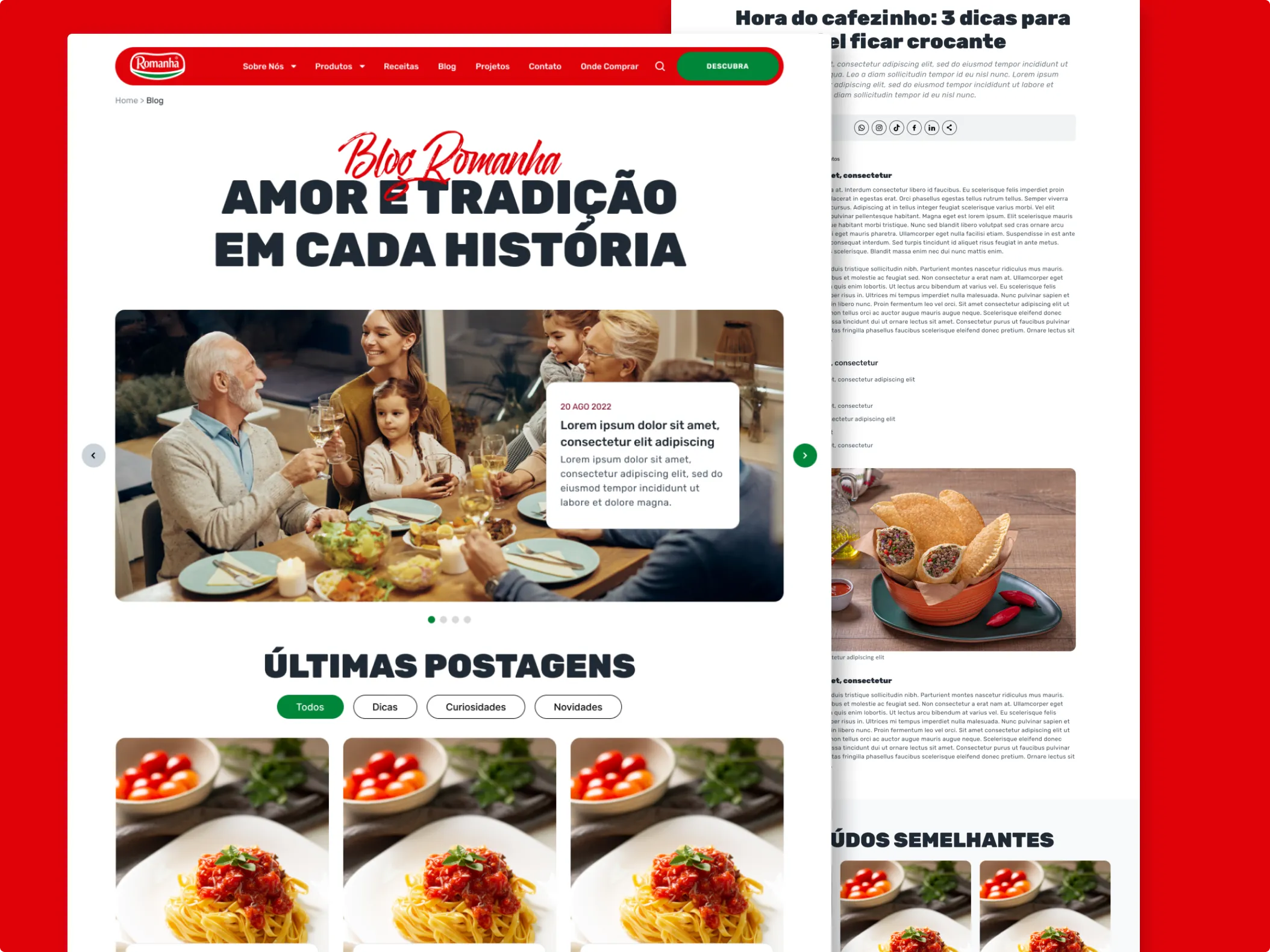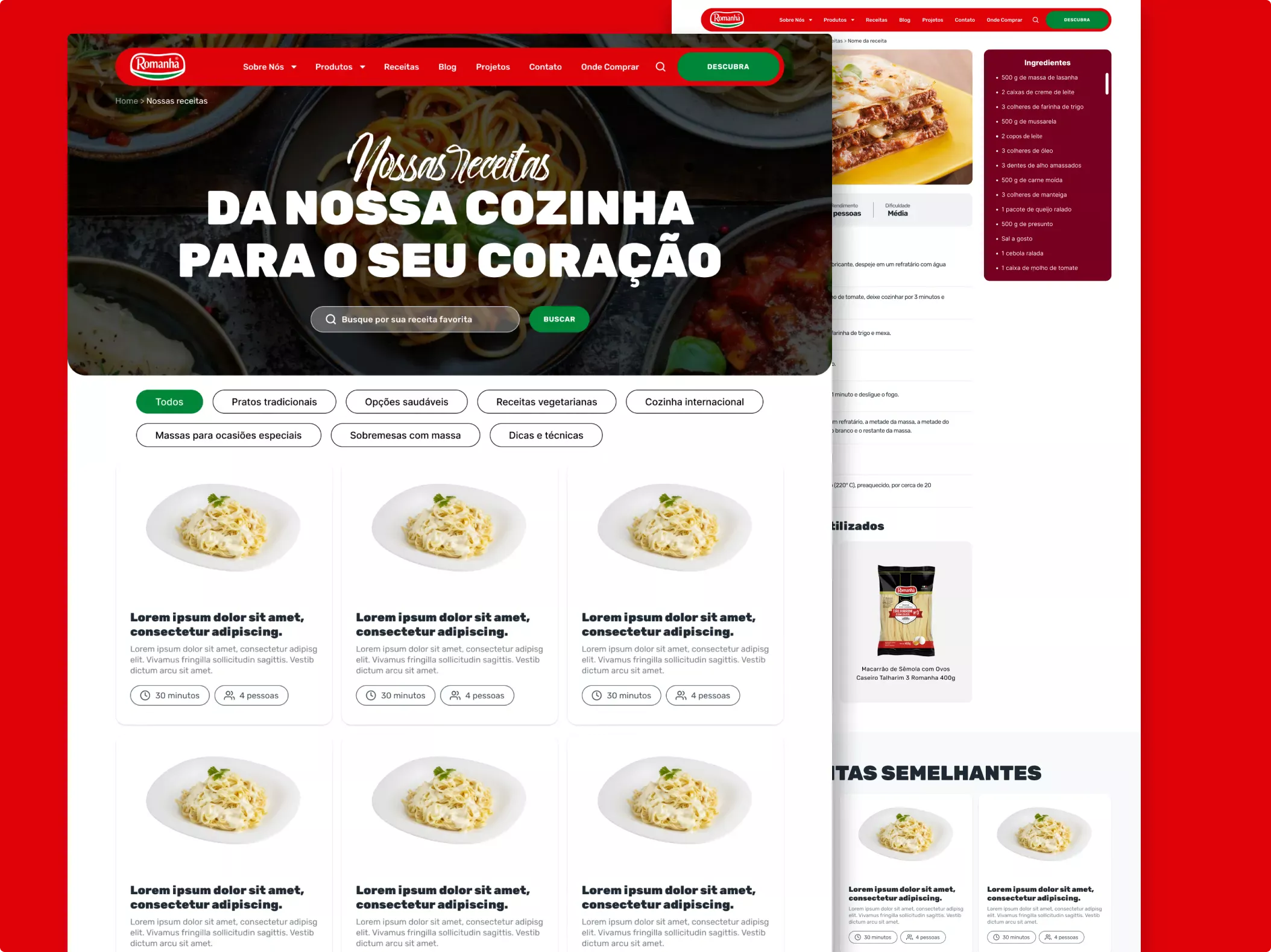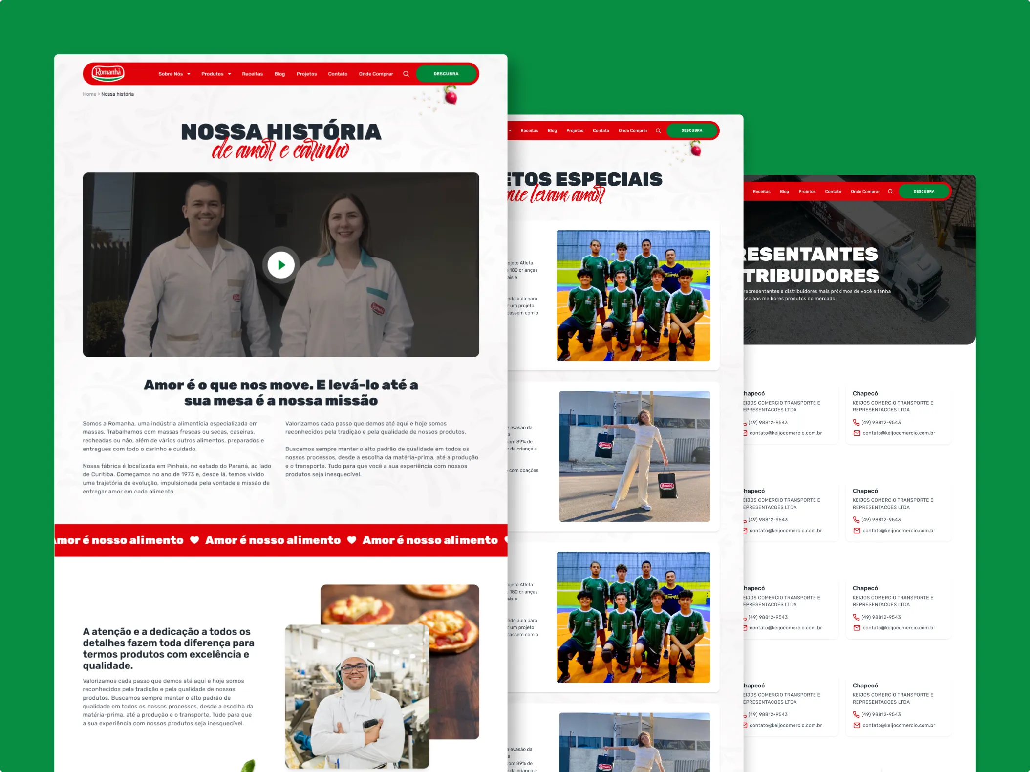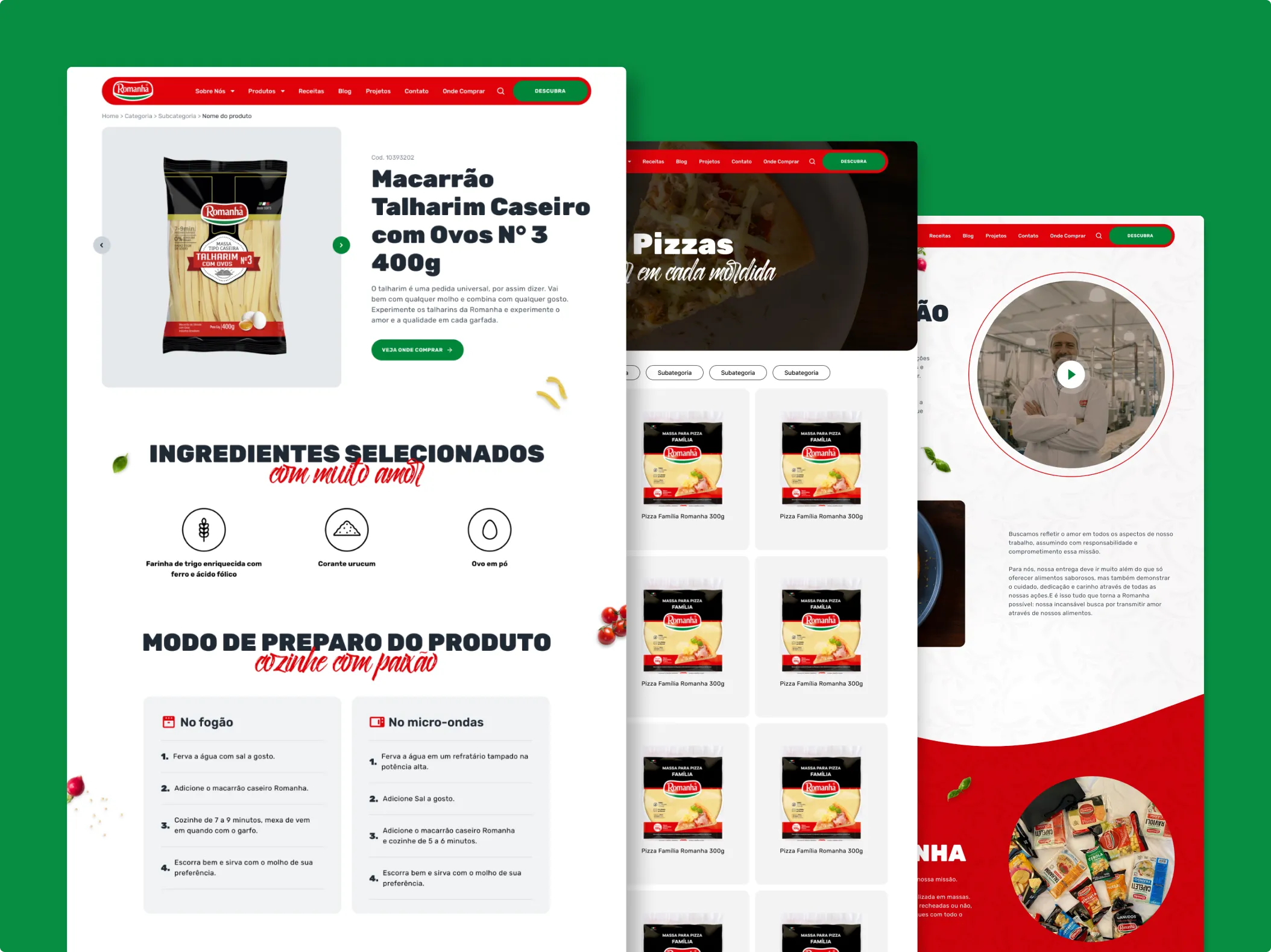 A Romanha, famosa por suas massas, expandiu sua presença em todo o Brasil, com mais de 8.000 pontos de venda. Agora, buscando modernizar-se, reconhece a necessidade de um novo site institucional. O antigo, de design simples, não representava sua diversidade. Surge a demanda por uma plataforma mais atrativa e funcional, transmitindo eficazmente seus valores, história e produtos.